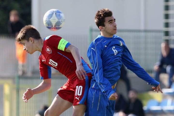Adam hlozek challenges for a header in a friendly against italy | maurizio lagana/getty images.